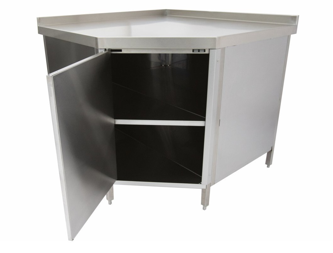 Corner base cabinet. . hinged door. . middle shelf. . height adjustable plastic feet. . construction scotch bright finish 18/10 aisi 304. . dimension: 1000 x 1000 x 900 mm. Made in uae by Zeenath Kitchen