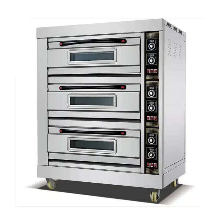Electric oven. . cap: 3 deck / 6 trays. . With timer . tray size: 400 x 600 mm. . temp: 20 ~ 300 °c. . power: 3N-380V / 50Hz / 19.5 kw. . dim: 1220 x 820 x 1530 mm. HTD-60H / by: euro star / made in China