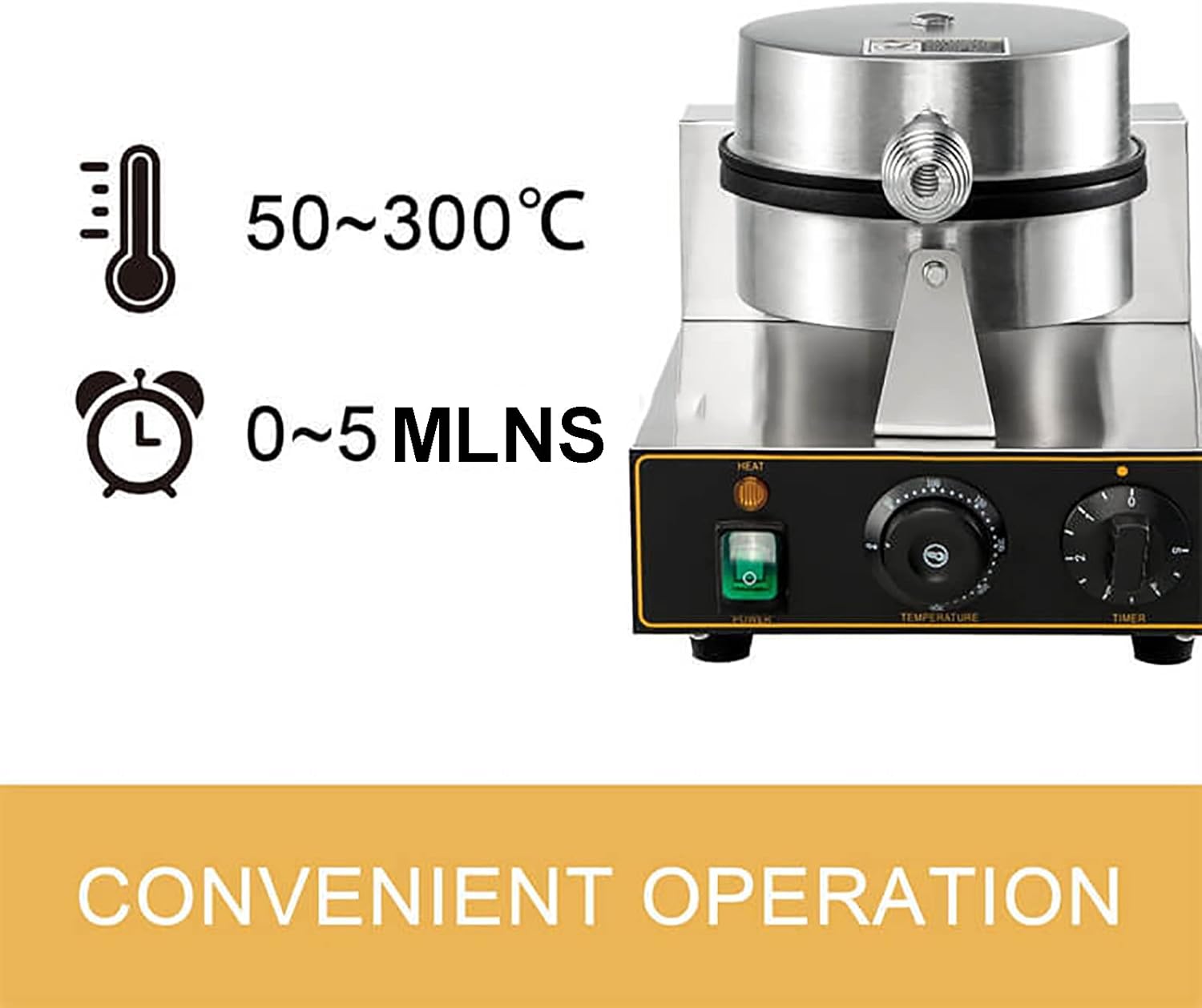 Waffle baker. . single head. . timer. . temp: 50 ~ 300 °c. . power: 220-240 v / 50 hz / 1200 w. . weight: 7 kg. . dim: 250 x 345 x 210 mm. RY-1 / made in China